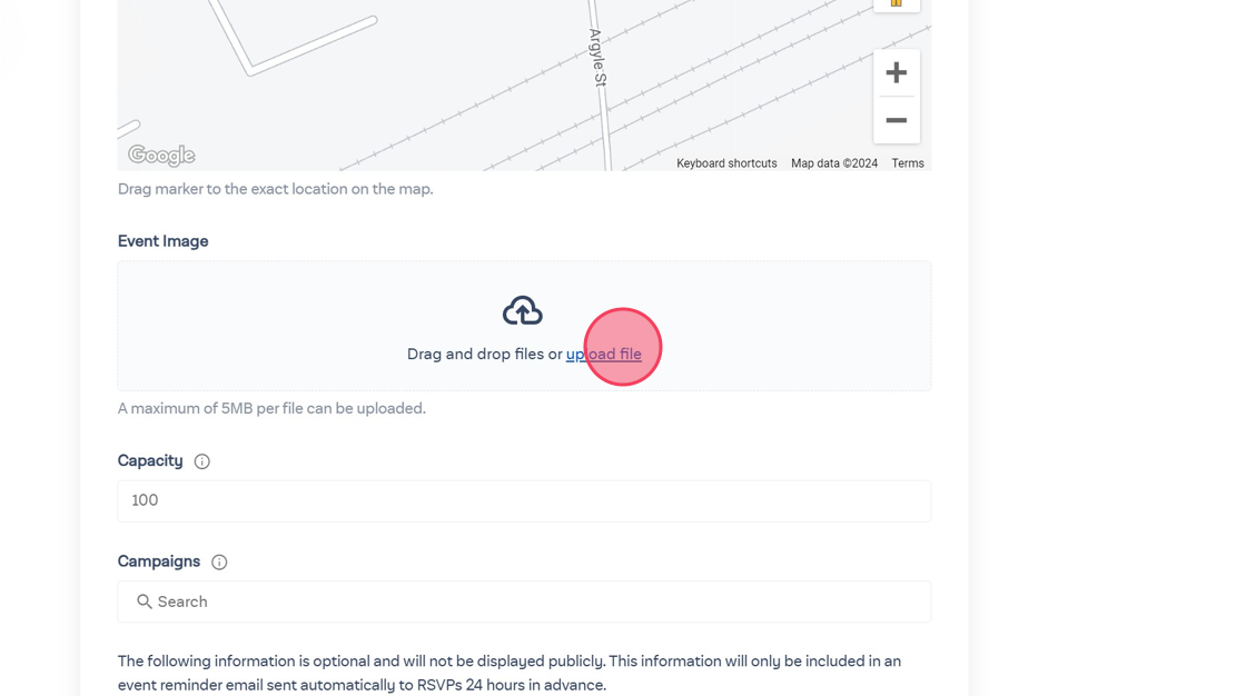 14. To add a custom image to your event which will appear on the public website, click upload file.