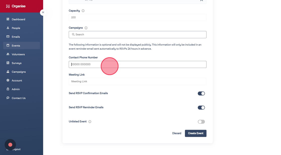 17. Add a contact phone number for your event organiser if relevant. The phone number won't display on the public events site and will be emailed to RSVPs in the event reminder email.