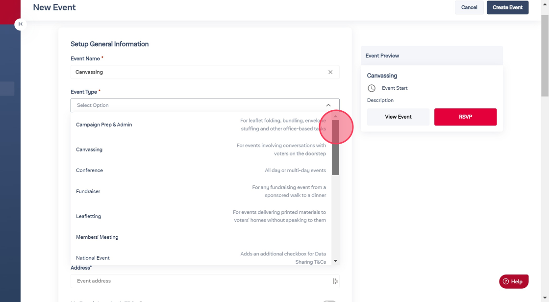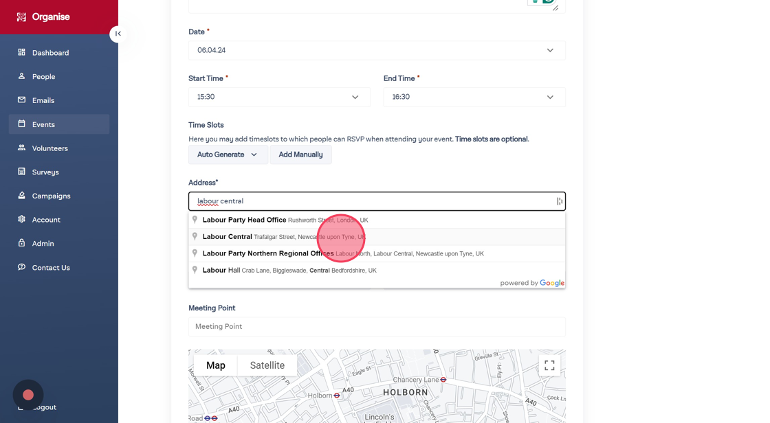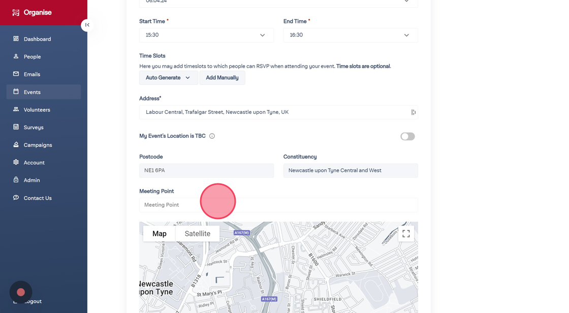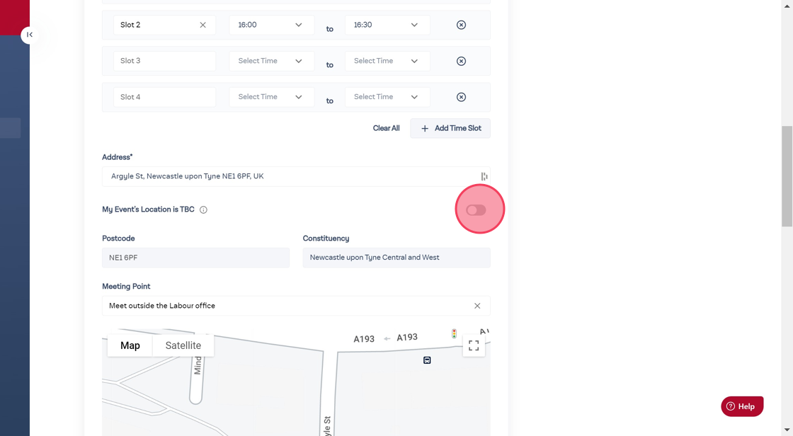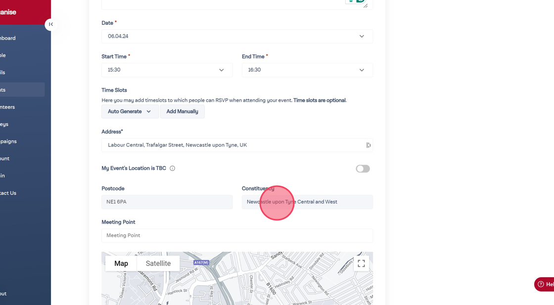 13. If you do not have a confirmed location for your event, you can list the event as Location TBC by clicking the toggle to switch it on. You will no longer have to enter an address for your event, your event will not be listed on the public events site and will only be accessible by direct link. Please note that this option is not recommended for general public-facing events such as canvasses. To attract as many volunteers as possible, such events should be listed on the public website with an address in the relevant constituency. It is acceptable to list a placeholder address with an explanation in event description that the specific location will be confirmed.