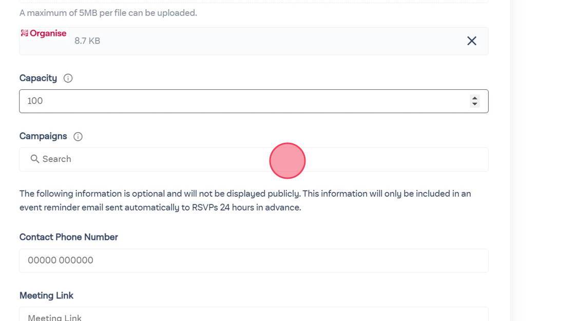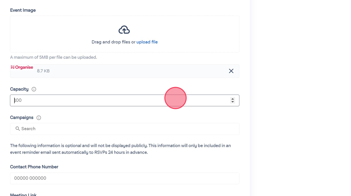 15. If your event has a capacity, for example if you are holding a public meeting in a venue with limited seating, you can enter a capacity here. This means that once that number of RSVPs have been received, no more can be submitted. Please only enter a capacity if your event has a hard limit - most events don't need a capacity.