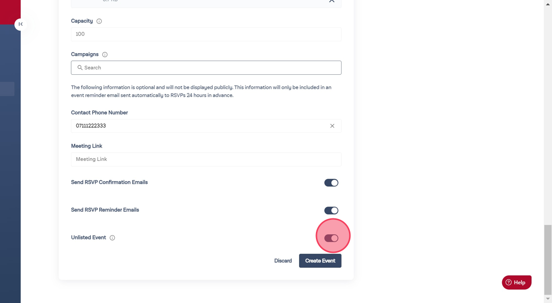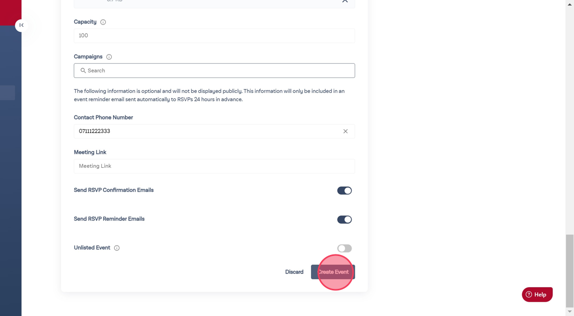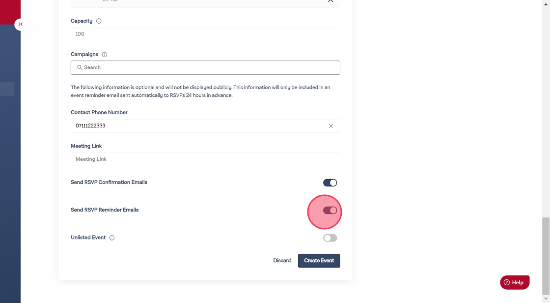 20. If needed, you can switch off the automated event reminder emails by clicking the toggle. If left on, any person who RSVPs to your event will receive an email 24 hours before the event to remind them of the details.