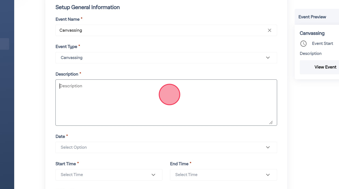4. Type a description of your event in the 'Description' box. The description will display on your event on the public events website. Make your name and description as clear as possible so people know what to expect. If it’s a meeting or talk, who can come, and do they have to register? If it is a campaign session, what tasks are there that need doing, and do attendees need any experience?