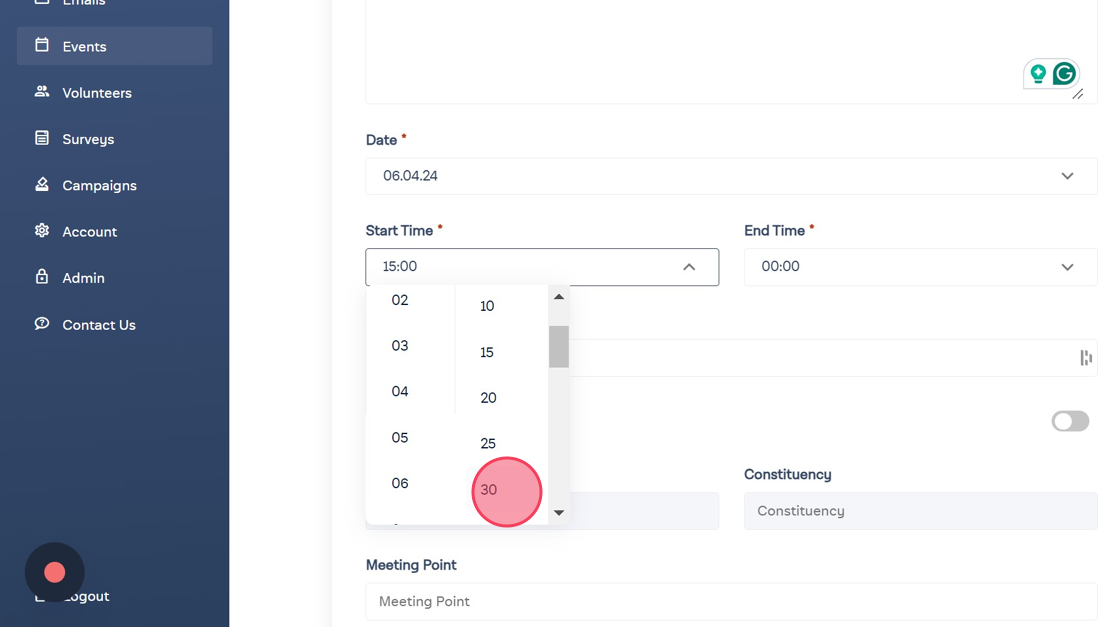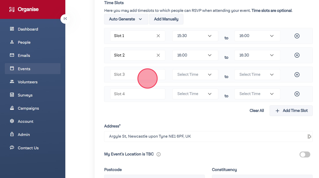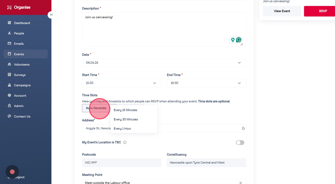 7. If you are holding multiple similar events in one day, for instance if you are running an all-day campaign centre for an election, you can add time slots into one event so people can sign up for the specific time they can attend without you having to create dozens of events. You can autogenerate time slots for set intervals, or you can add time slots manually.