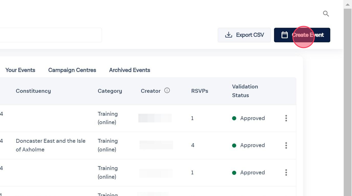 1. In the Events area of Organise, click 'Create Event' to create a new event.
