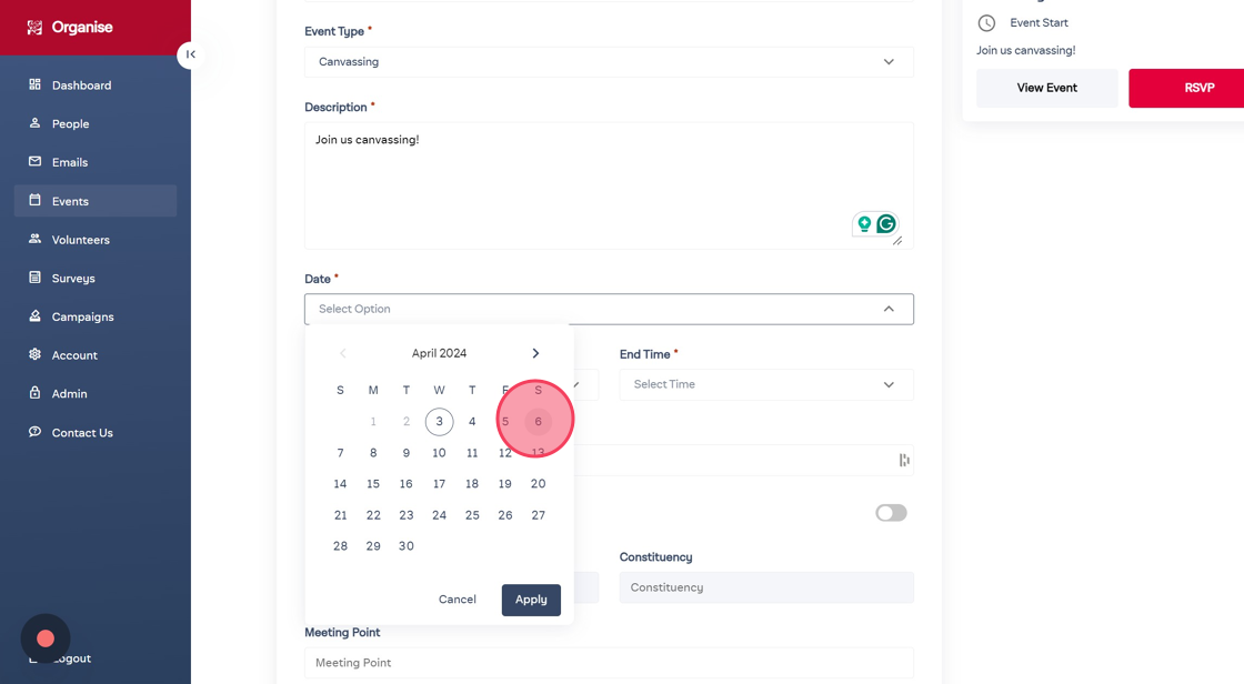 16. Search for a Campaign to link your event to. Campaigns allow you to easily manage both events and volunteers on Organise, and linking your event to a Campaign means that any volunteers who RSVP will be added to that Campaign automatically. We recommend linking any canvassing, leafletting or other campaign-related events to your Organise Campaign.