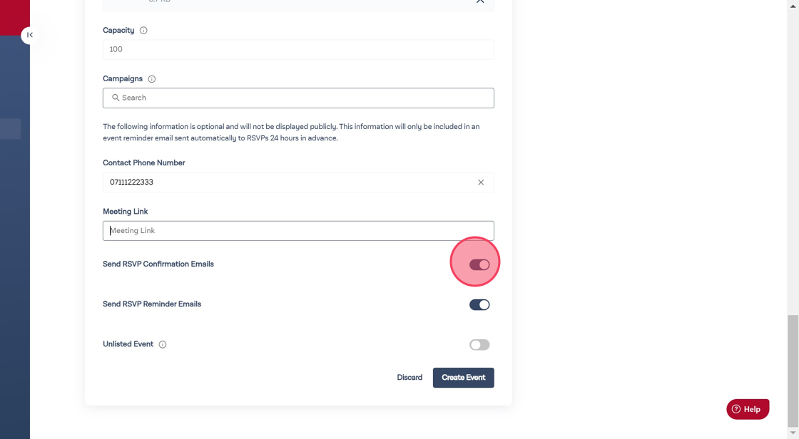 19. If needed, you can switch off the automated RSVP emails by clicking the toggle. If left on, any person who RSVPs to your event will receive an email thanking them for signing up.