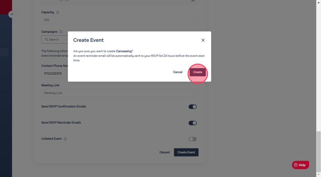 23. You will be prompted to confirm that your event is ready for publishing. Click 'Create' and your event will be published on events.labour.org.uk