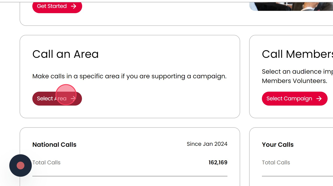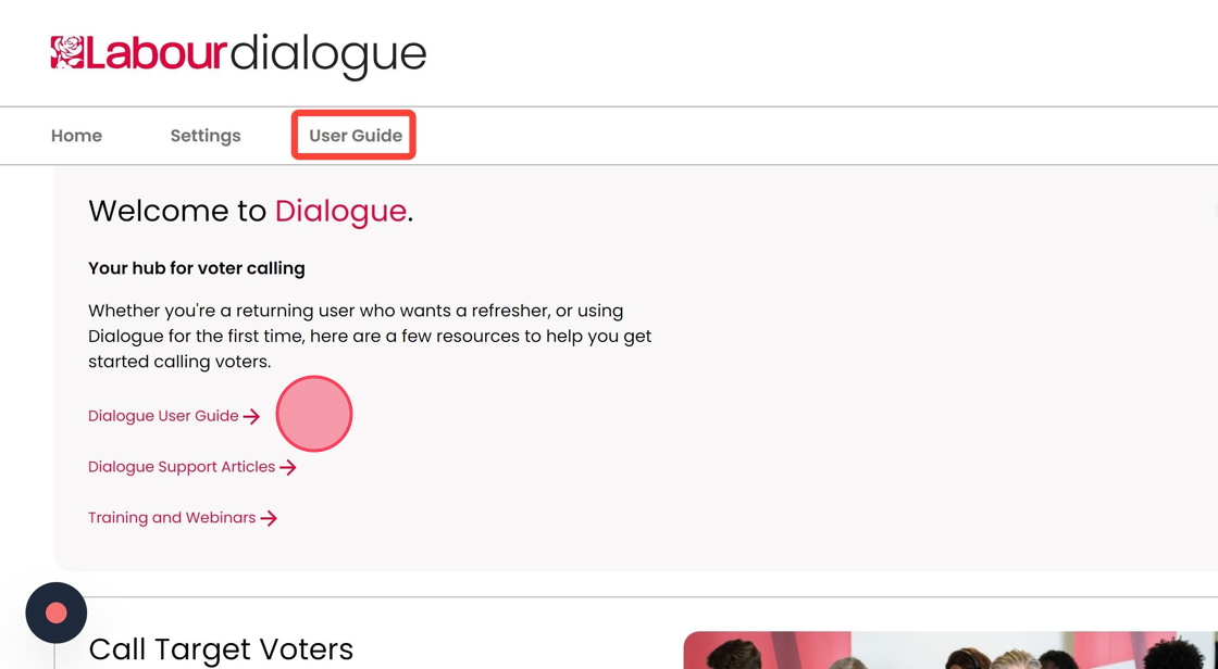 3. On Dialogue you have three calling options: 'Call Target Voters', 'Call An Area' and 'Call Members and Volunteers'. This guide will show you how to call target voters and voters in a particular area. To learn about member and volunteer calling, please see How to call Members and Supporters.