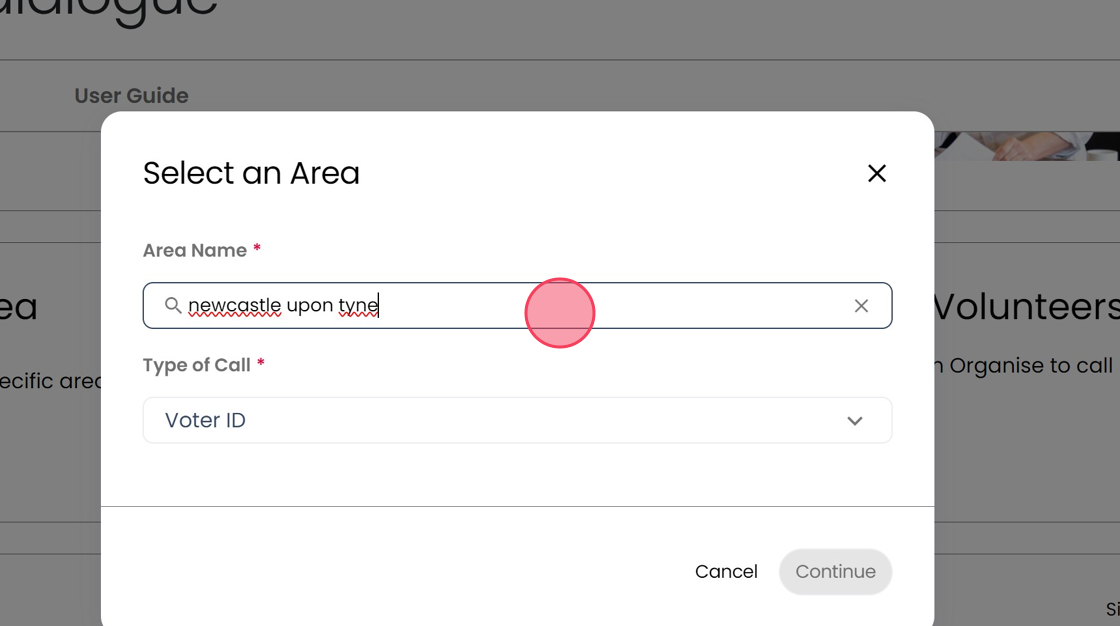 15. Type to search for the area you want to call. This could be a constituency, ward, or a larger area like a council borough.