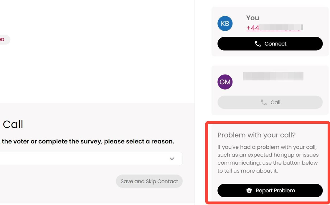 7. If you do not hear a ringtone, it is likely that Dialogue cannot connect with the voter. There are many reasons for this such as a wrong number. You can tell us about issues with calls by using the 'Report Problem' button.