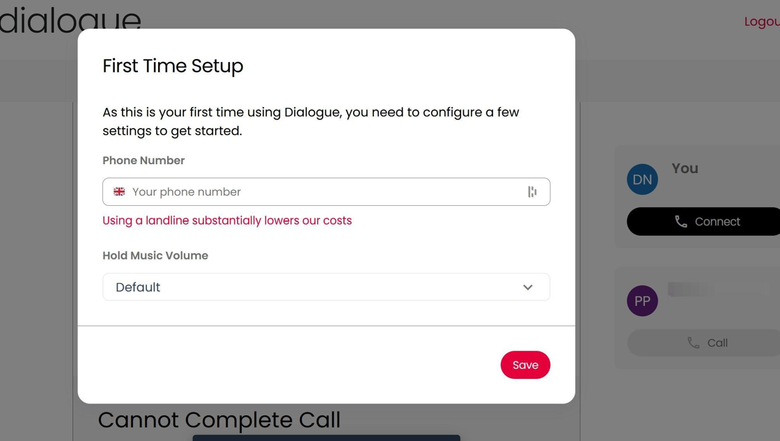 You will first need to connect your phone with Dialogue. Click 'Connect' and wait until your phone begins to ring. Once you have answered you should begin to hear hold music on the line. Please note that you can remain connected to Dialogue throughout your calling session (there is no need to hang up.) You will use the on screen buttons to end calls.