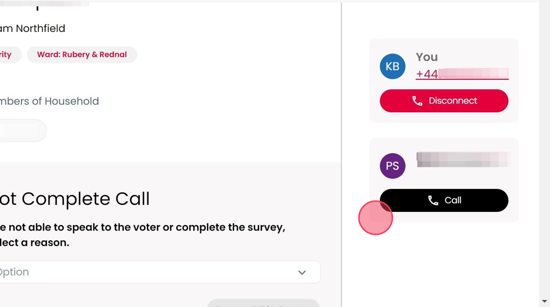 5. A contact will load on screen. During an election cycle, information about their polling district will show on the left of the screen. Their name, constituency and categories will show in the middle of the screen, along with the names of any other people in the same household. To the right of the screen are the calling buttons.