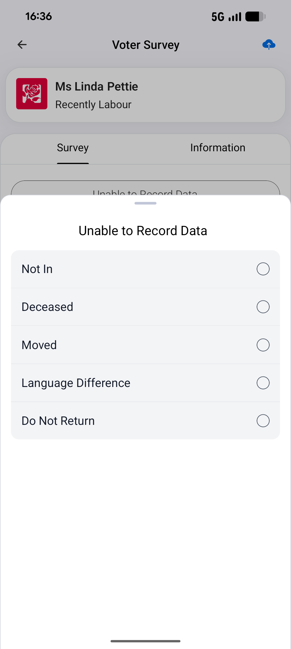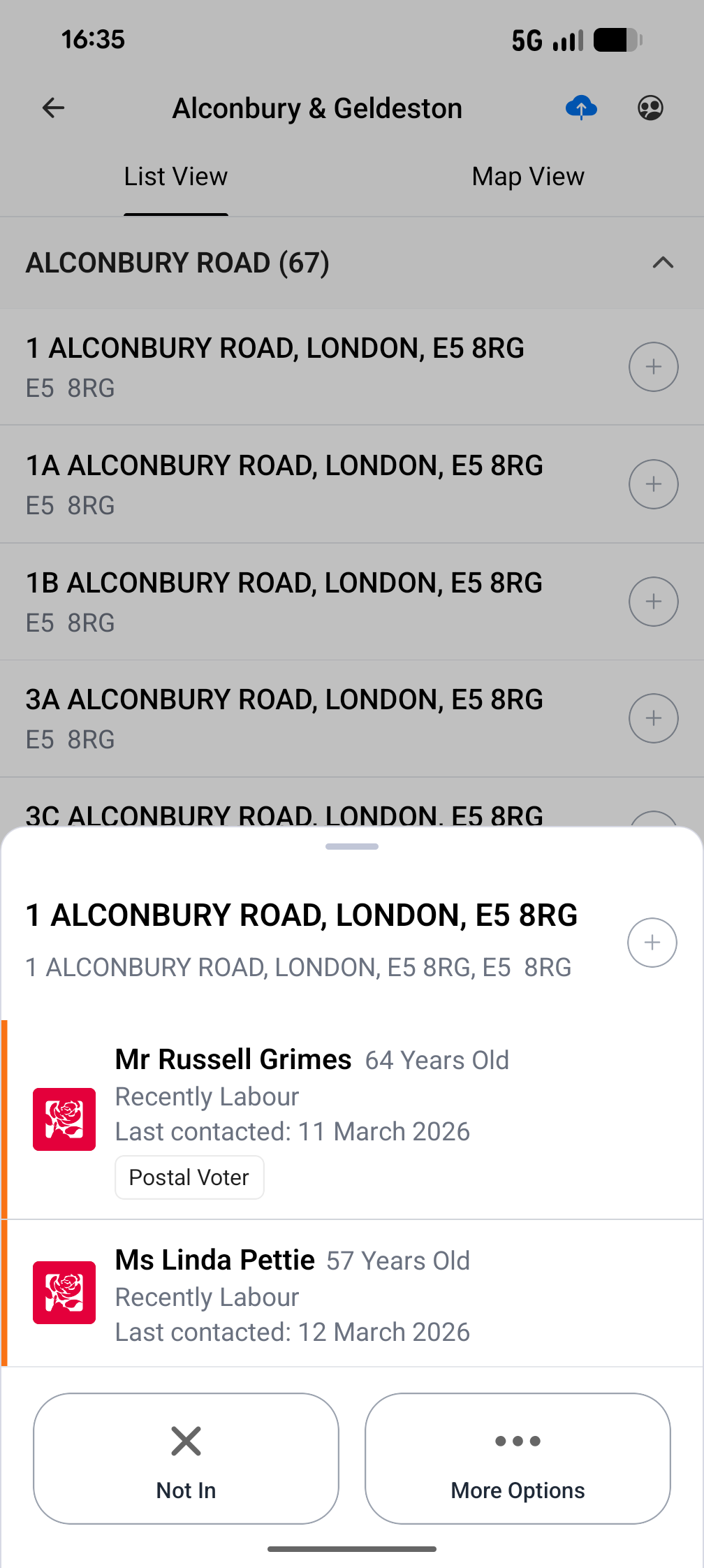 To log any information or complete the voter survey, click on the relevant property to view the members of the household. The menu will show basic information including full name, age, last known voting intention and when they were last contacted.