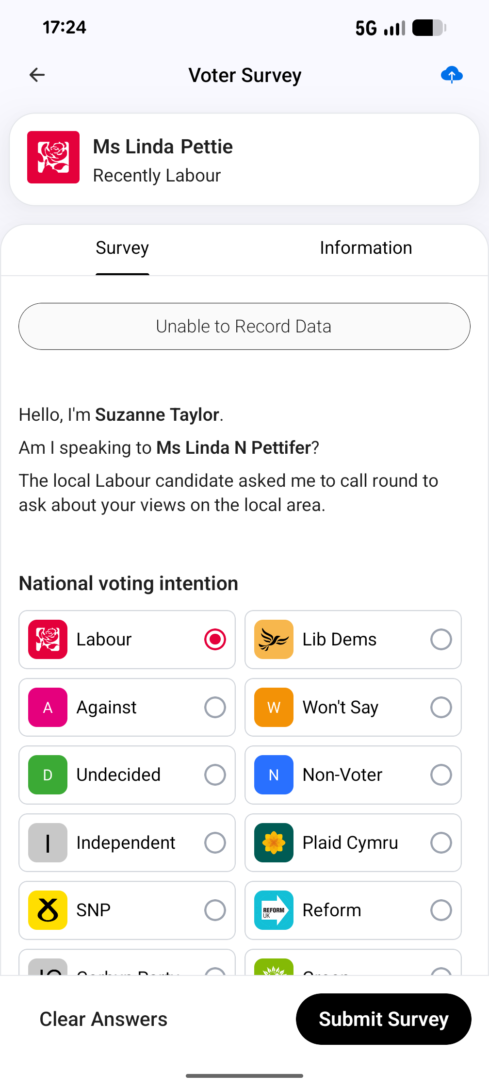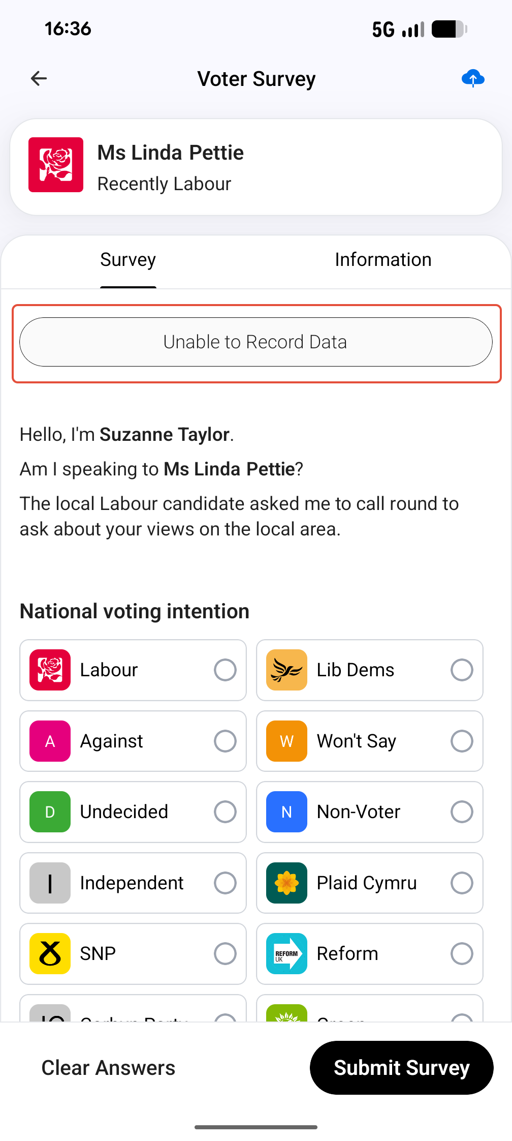 To enter data in the voter survey, click on the answers to fill them and scroll down to see more questions.