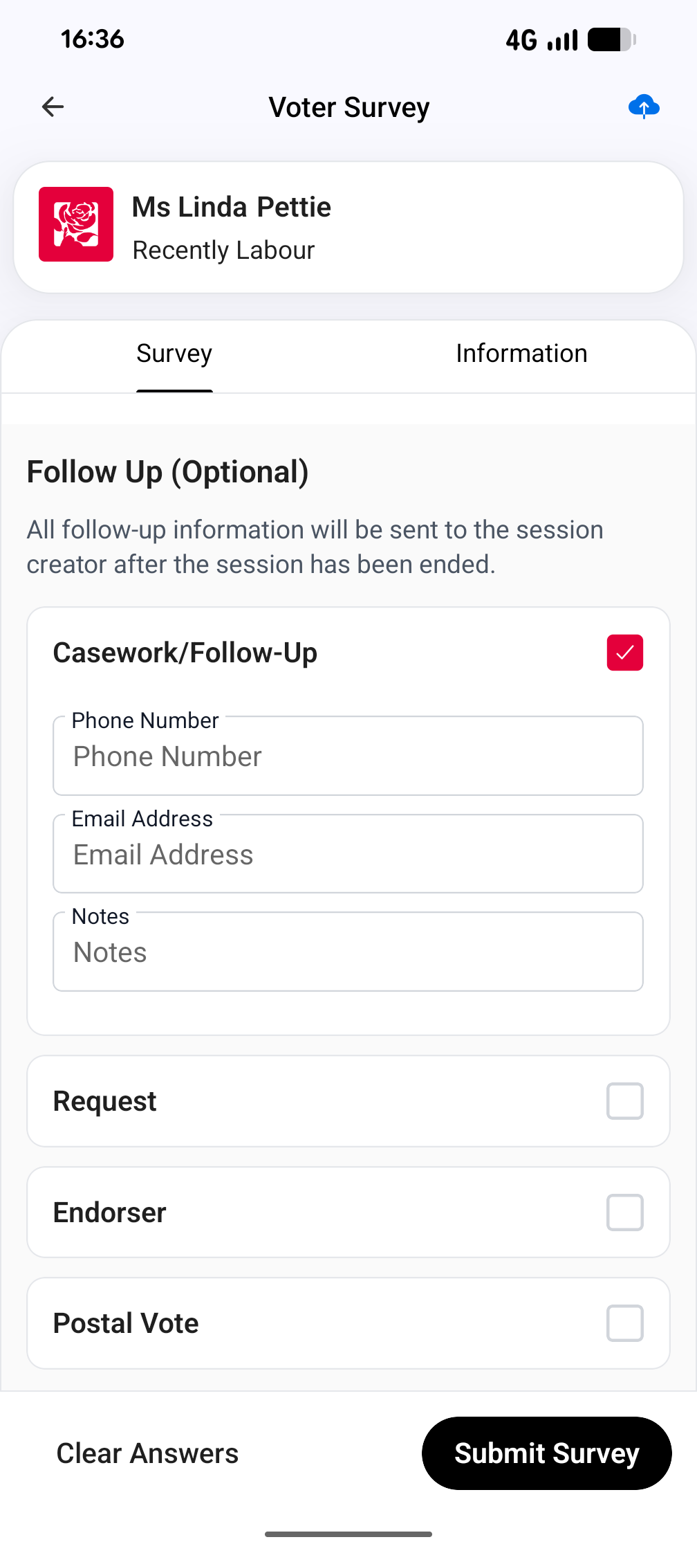 Follow up options including logging contact information for casework and candidate follow ups, requests for posters or garden stakes, marking a contact as a potential endorser and logging a request for a postal vote form are at the bottom of the survey. Click on the boxes to open the keyboard for typed answers.