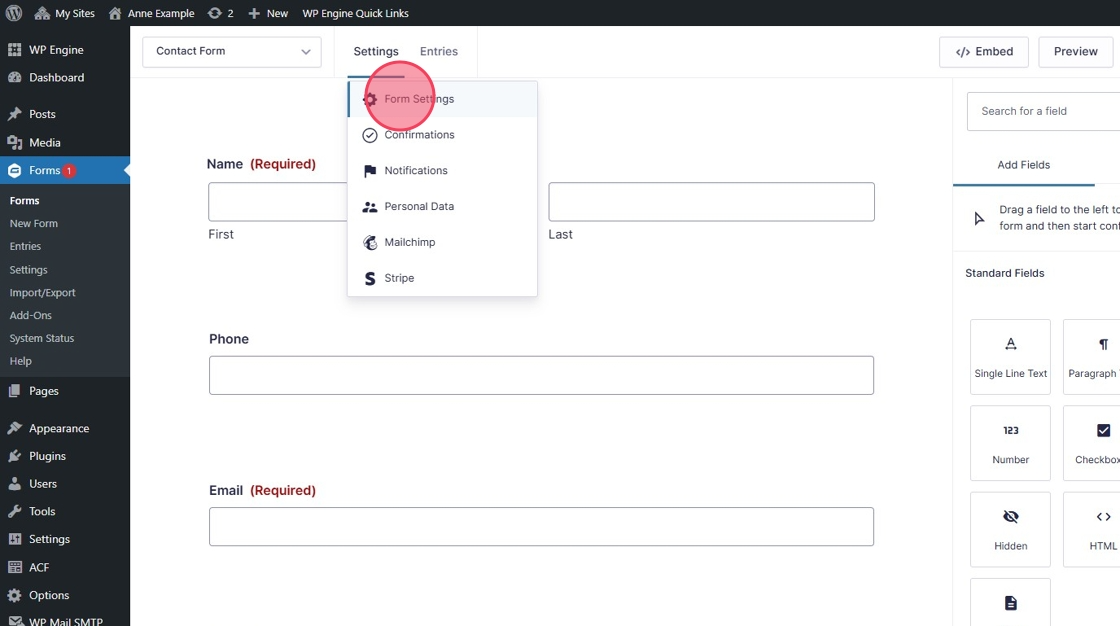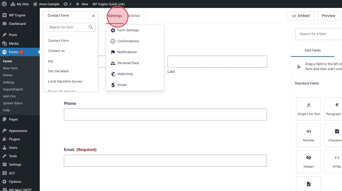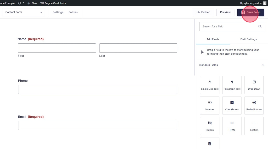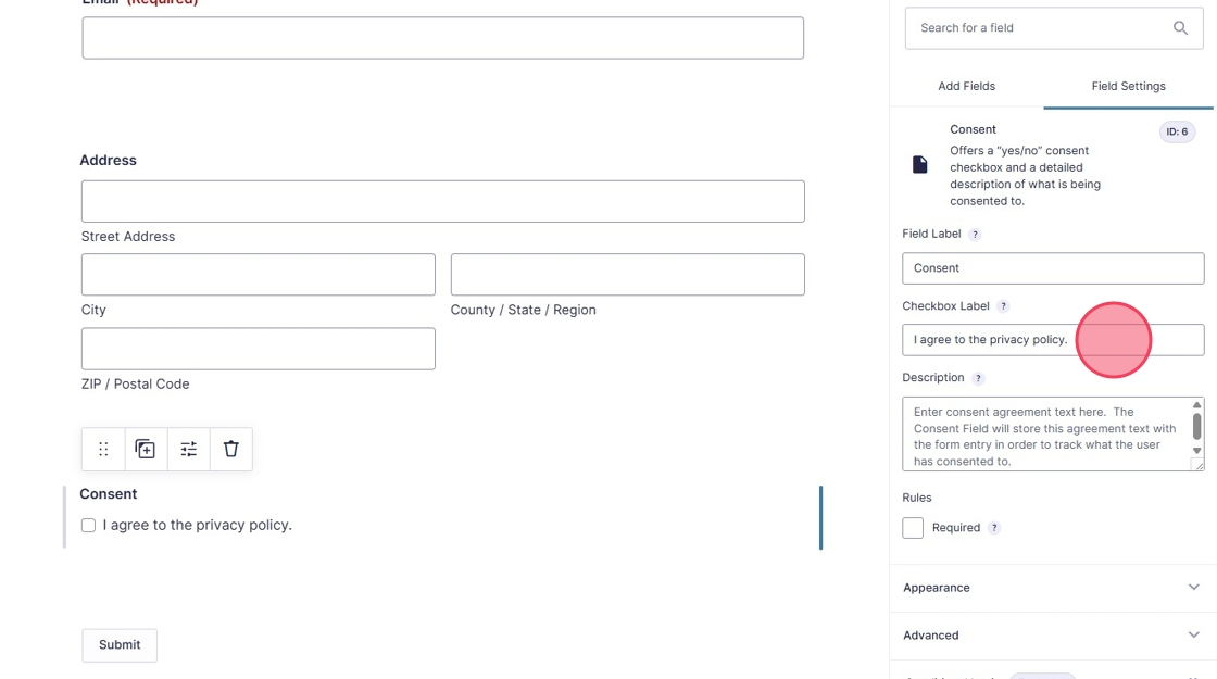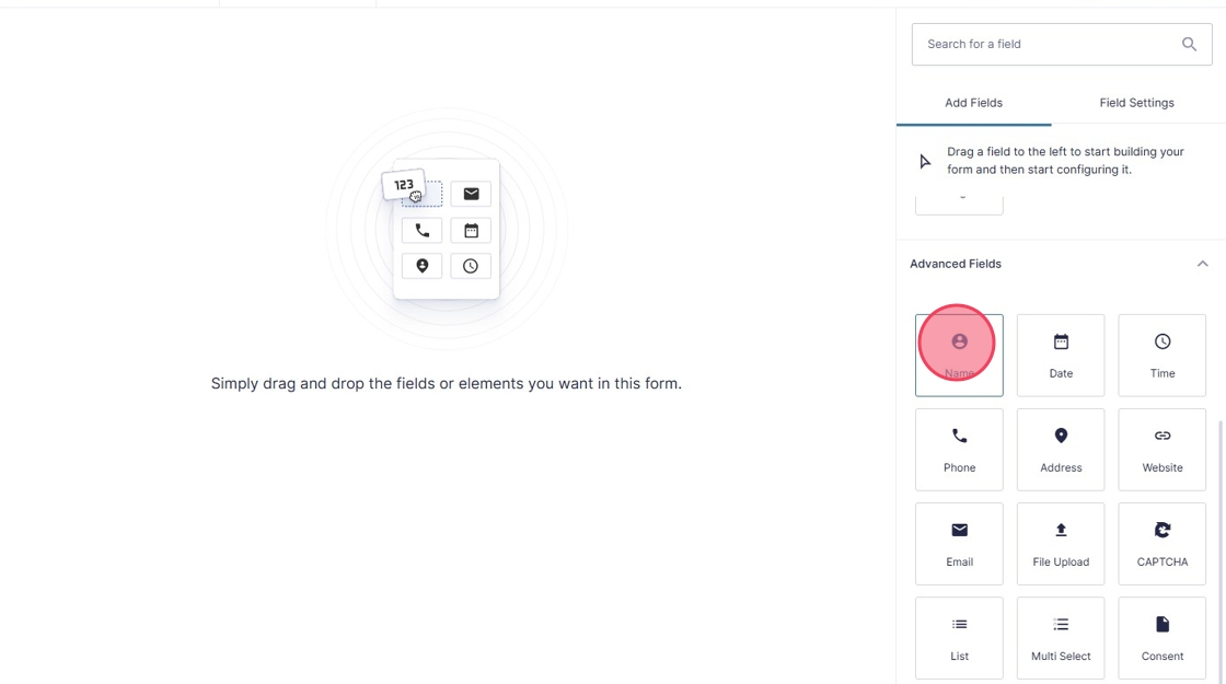 9. To make changes to any of the fields you click on the field and the "Field Settings" Panel will open to the left.