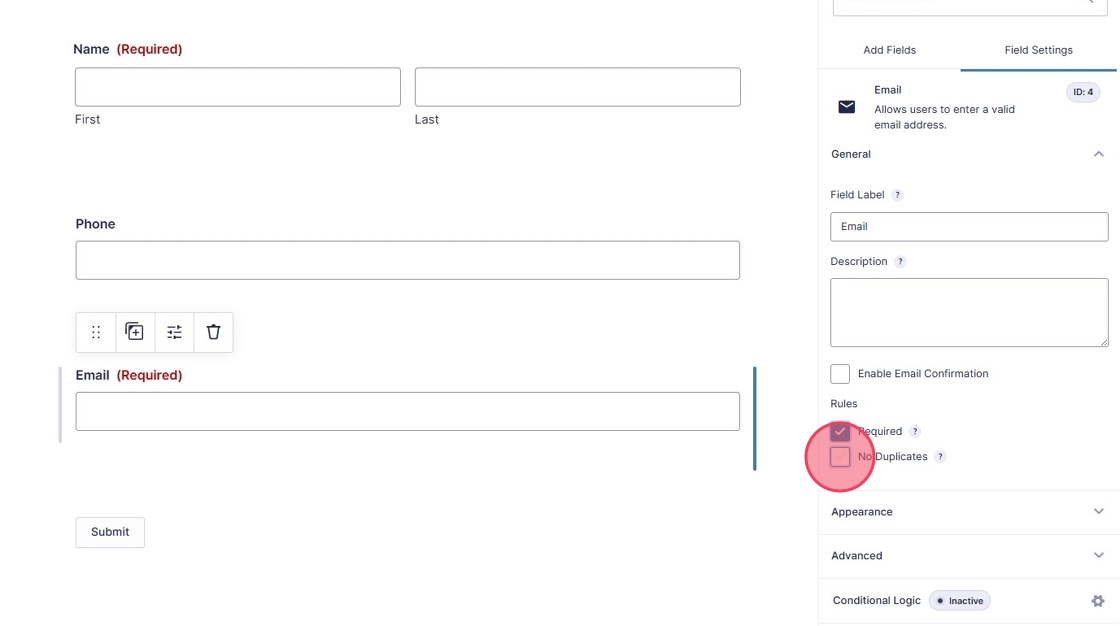 11. On certain fields you can add the rule "No Duplicates." This will prevent anyone responding more than once.
