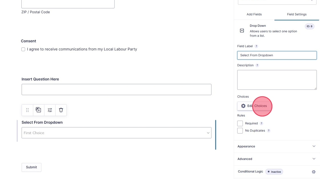 14. If you select any questions with multiple choices, you may need to edit theses choices, to do this you can select "Edit Choices" in the right hand panel.