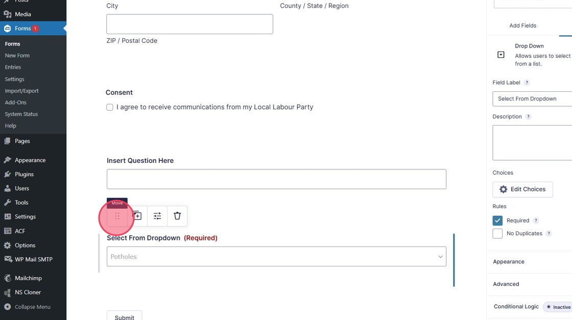 19. To move your questions within the form, simply click the 6 dots above the question and drag into position.