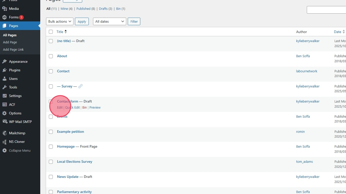 2. Find the page you wish to add the for to and click "Edit," or add a new page.