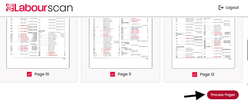 11. Use the page selector to deselect any pages which do not contain individual voters’ names and Polling Numbers. Click on pages to enlarge them.