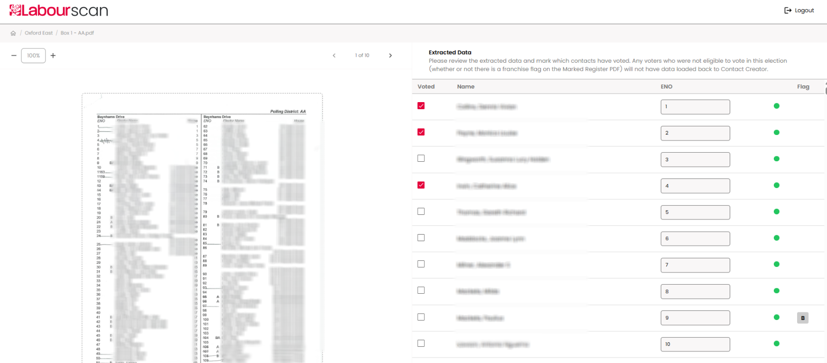 18. Carefully go through each voter and make sure the AI has interpreted the data correctly. If it is wrong, you can use the checkbox to correct the voted/not voted status, or the Polling Number/Elector Number (ENO).