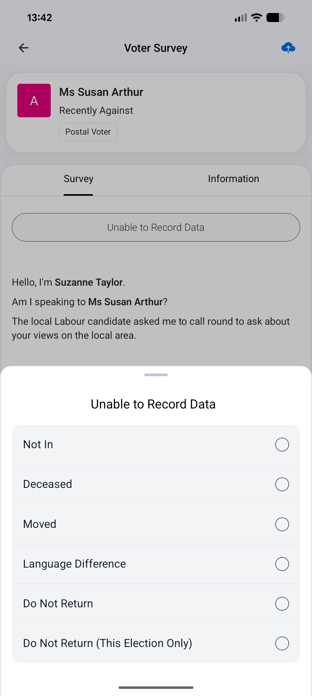 To enter reasons for an individual, select 'Unable to Record Data' at the top of the voter survey: