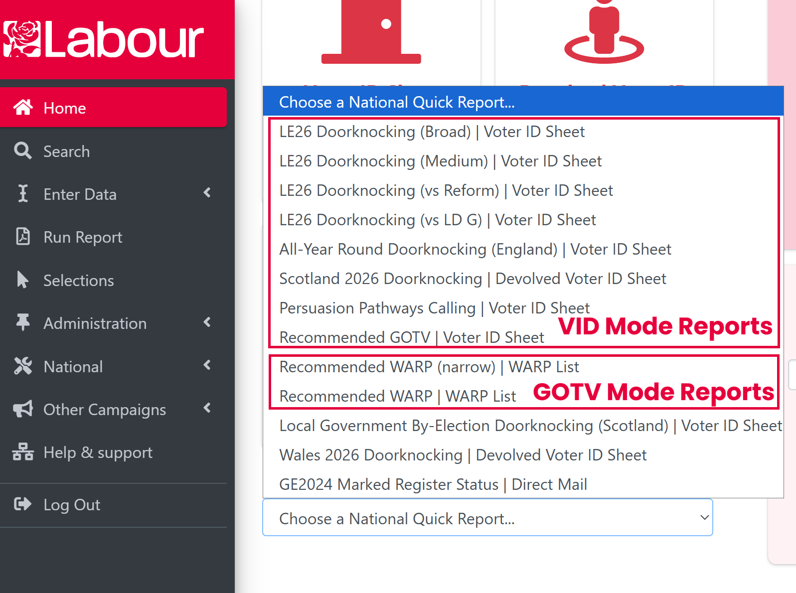When you export a WARP session from Contact Creator, the app will automatically use GOTV mode logic in your session. As a general rule, if the report says 'Voter ID Sheet' at the end of the title or as the type, the app will use Voter ID mode. If the report says 'WARP Sheet' at the end of the title or as the type, the app will use GOTV mode.